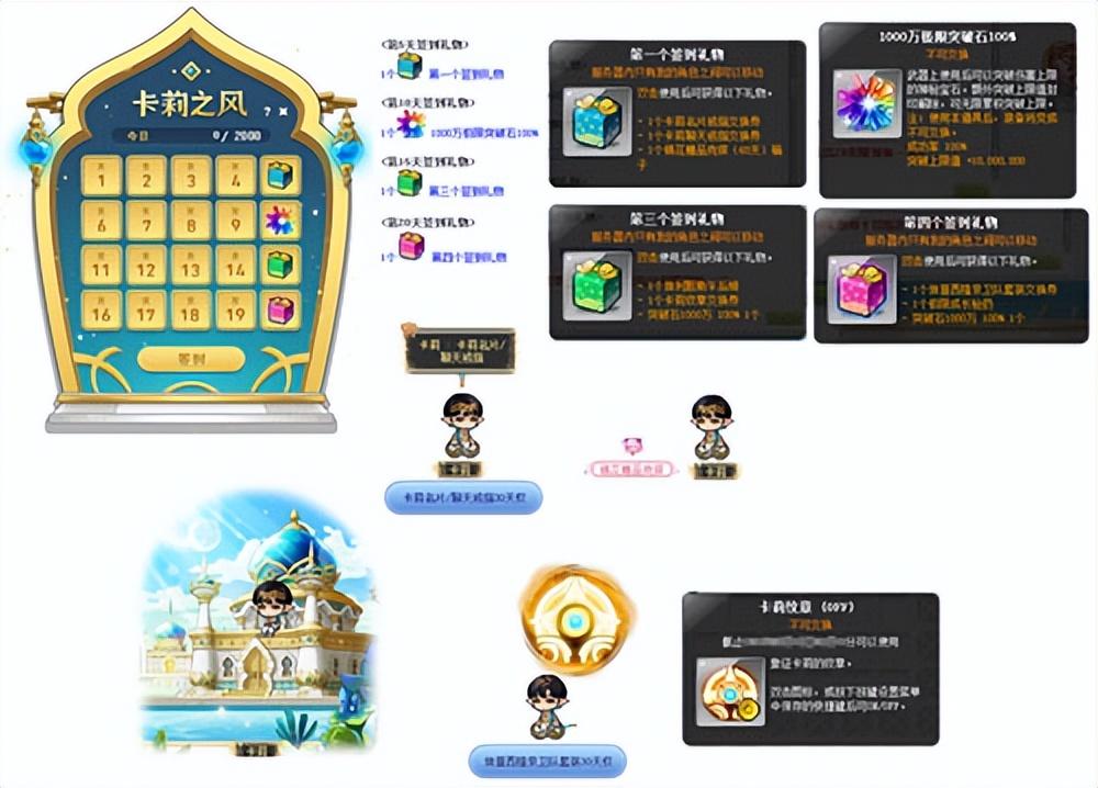 7月12日起至9月5日,飞刃沙士职业达到200级后可接取[卡莉之风]延续的旅程任务, 每天消灭2000只等级范围内怪物,点击“签到”按钮可以盖上每日签到图章,在第5/10/15/20天的时候还会发放特别礼物!