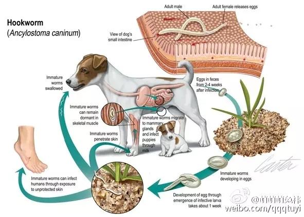 寄生狗狗的小肠和胃内引起的。可通过母体传播,通过胎盘移行到胎儿肝脏而引起胎内感染。胎儿出生后,幼虫移行到肺脏,然后再移行到胃肠道发育为成虫,在仔犬出生后23~40天已出现成熟的犬蛔虫。新生仔犬也可通过吸吮初乳而引起感染,感染后幼虫在小肠中直接发育为成虫。主在危害1~3月龄的幼犬,影响生长和发育,严重感染时可导致死亡。