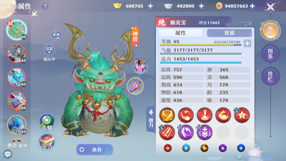 血耐宠是天音高端局的标配,建议55级的青铜兽、65级的锦鲤仙子当胚子。技能搭配健壮、自愈、重生、护体、护灵、隐身等生存向技能,战斗中不需要出手,帮助团队解封、复活即可。