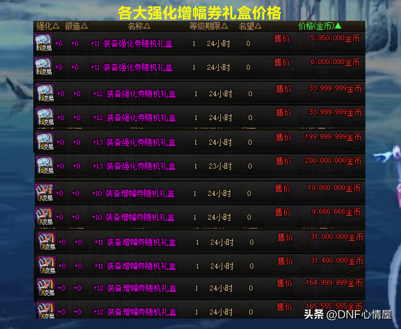 其实土罐的魔盒中,还包含了诸多强化、增幅道具,比如+11装备强化券随机礼盒、+10装备增幅券随机礼盒、+12装备强化券随机礼盒、+11装备增幅券随机礼盒、+13装备强化券随机礼盒和+12装备增幅券随机礼盒,也都价格出现下跌。