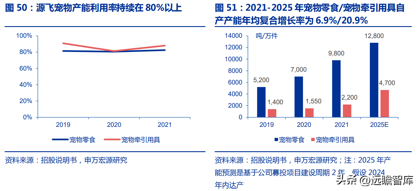 本次 IPO 公 司募投“年产咬胶 3000 吨、宠物牵引用具 2500 万条“项目,考虑 2 年的建设周期,假设 2024 年投产并于 2025 年完全释放产能,2021-2025 年宠物零食/宠物牵引用具自产产能的年均复合增长率为 6.9%/20.9%,本次产能扩张后,公司自产能力有望大幅增强,叠加外协供应链管理,充分保障公司新客户和新区域的开拓。
